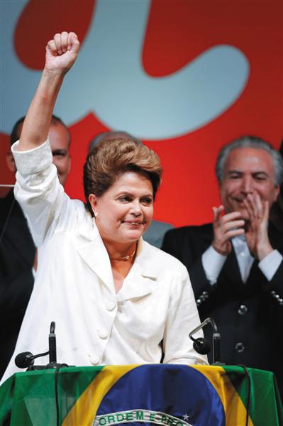 2014年10月26日,巴西现任总统、劳工党候选人罗塞夫在首都巴西利亚庆祝胜利。新华社发