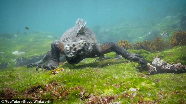 据英国《每日邮报》4月11日报道,潜水员史蒂夫·温科沃斯(Steve Winkworth)日前在太平洋东部厄瓜多尔附近的加拉帕戈斯群岛(Galapagos Islands)海水下拍摄到一只体型巨大的海鬣蜥捕食的画面,形似电影中的怪兽哥斯拉。