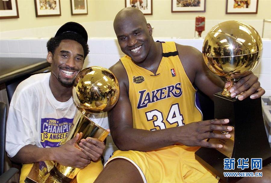 这是2000年6月19日,洛杉矶湖人队夺得2000年NBA总决赛冠军后奥尼尔(右)与科比手捧奖杯合影。新华社发