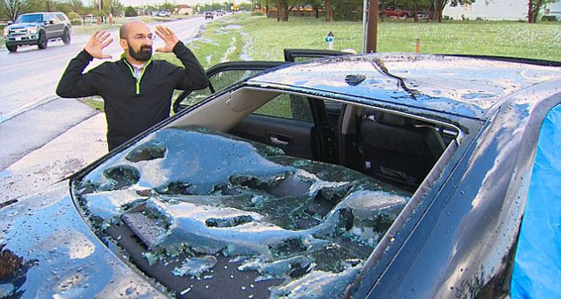 这名男子的汽车也遭到冰雹侵袭,当时他8个月大的女儿也坐在车里。(网页截图)