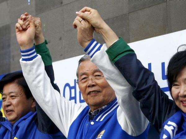 韩最大在野党共同民主党党首金钟仁(中)在竞选集会上向民众拜票。