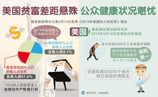 新华社北京4月14日电(记者吴晶晶、王小鹏)国务院新闻办公室14日发表《2015年美国的人权纪录》指出,2015年,美国在经济和社会权利保障方面缺乏实质性进步,工人为维护工作权利举行大规模罢工,食物无保障者和无家可归者数量庞大,公众健康状况堪忧。