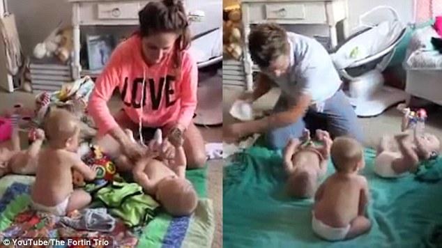 为了测试彼此为宝宝换尿布的技巧,赖安(Ryan)和德西蕾(Desiree)两夫妻决定以比赛的形式看看谁能在最短时间内为8个月大的三胞胎宝宝换完尿布并穿上衣服,并将比赛过程记录下来,做成对照视频发到网上。