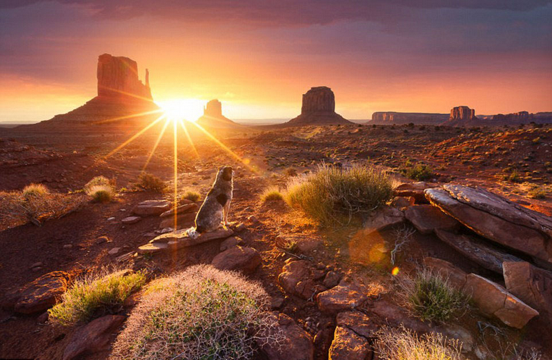位于美国西部犹他州的纪念碑谷,一只狗在仰望着天边的落日。