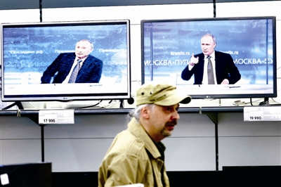 一名男子走过播放“与普京连线”节目的电视屏幕 供图/新华
