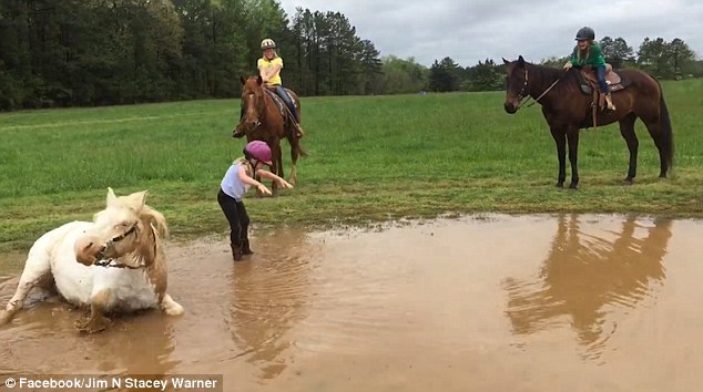 美矮种马忘情戏水 躺下导致小骑手遭殃(组图)