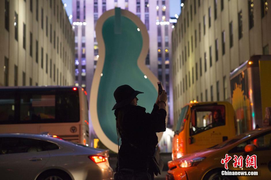 当地时间4月14日,公共艺术装置——一座重达4.5吨的竖立泳池雕塑矗立美国纽约洛克菲勒广场,引得路人欣赏。