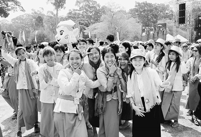 在吴哥宋干节开幕活动上,柬埔寨青少年喜迎各国游客。记者 张志文摄