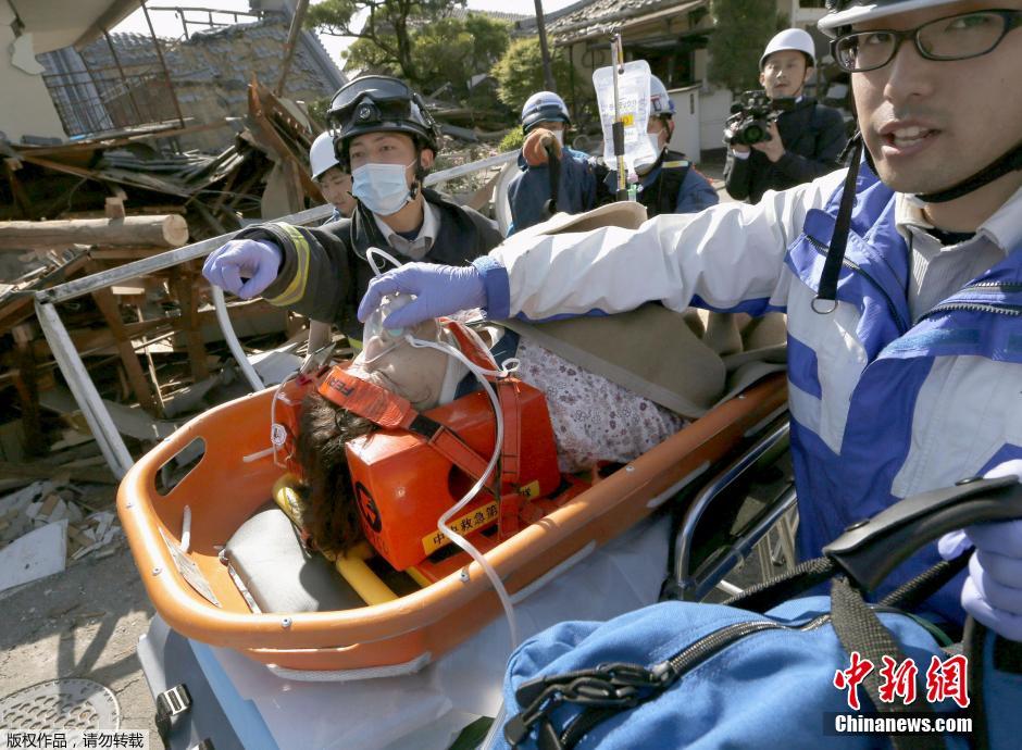 在益城町,一名女子被救援队员从坍塌的房子里解救出来。