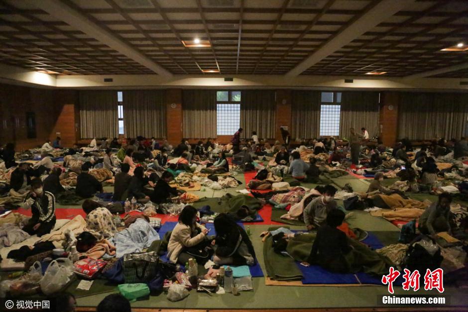 日本熊本,酒店客人在大堂避难。据日本广播协会(NHK)报道,熊本市一些市民受伤被送往医院,熊本县阿苏市有人因建筑倒塌遇难,具体伤亡人数仍在统计。当地不少建筑倒塌、桥梁塌陷,还有山体滑坡,警方接到多起关于人员被困废墟的求助。 图片来源:视觉中国