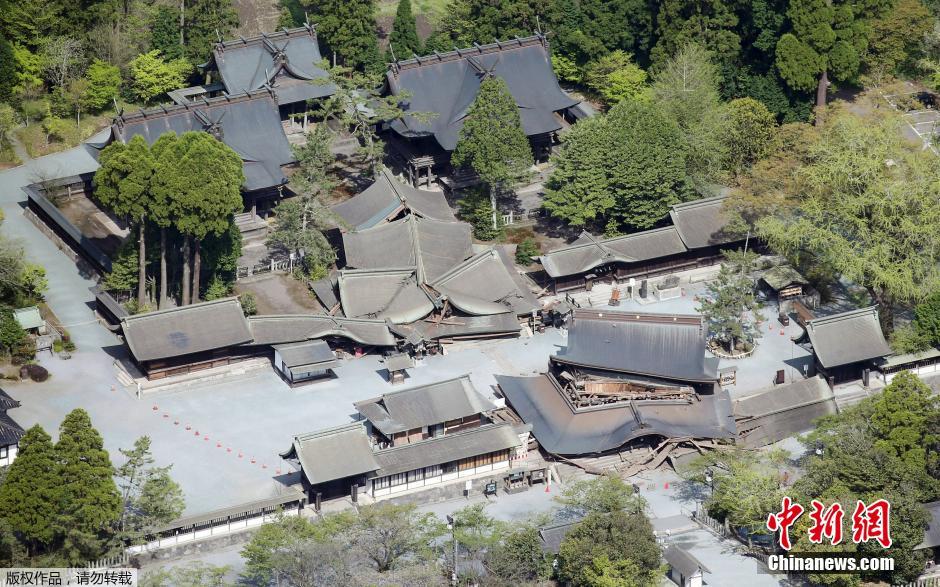 在7.3级强震下,熊本县拥有2500年历史的阿苏神社也遭到严重损毁。图中可以看到阿苏神社的楼门整个倒塌,现场也已封锁,防止危险再度发生。