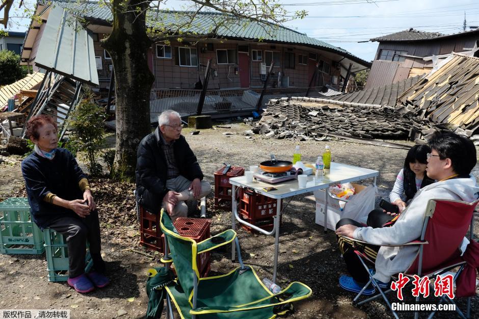 当地时间4月17日,日本熊本县震后见闻。一家人围坐在简易桌旁吃饭,周围都是倒塌的房屋。