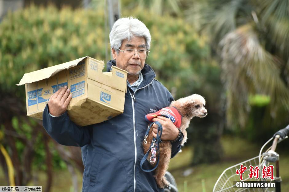 当地时间4月17日,日本熊本县震后见闻。一位老人抱着自己的爱犬领救灾物资。