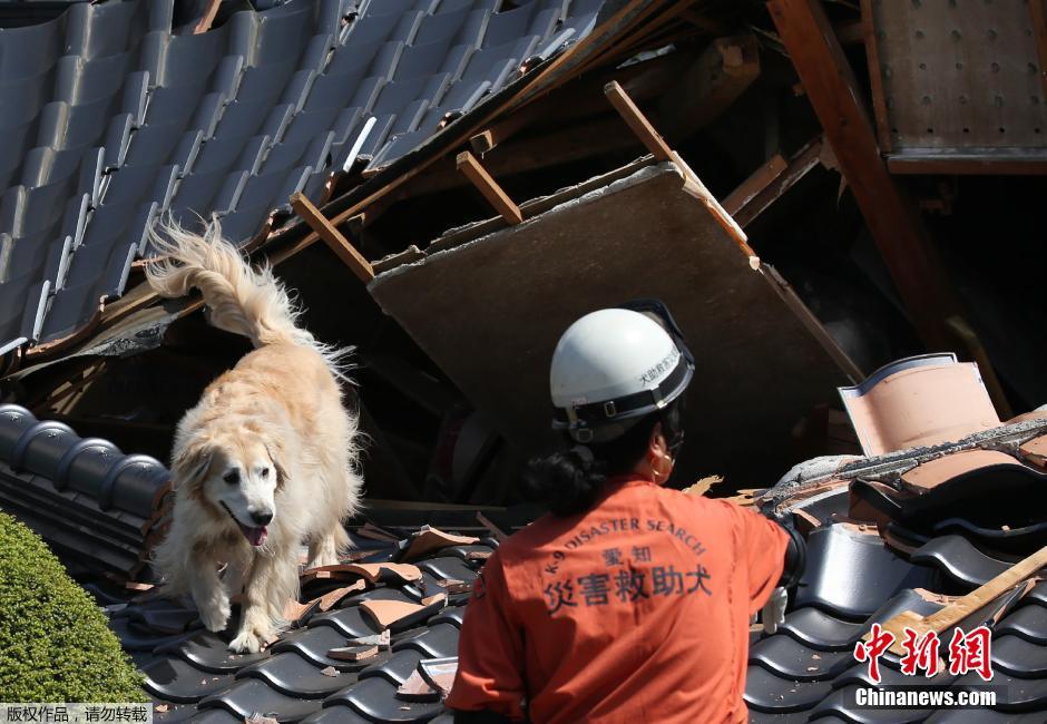 当地时间4月17日,日本熊本县震后见闻。搜救犬进入废墟找寻幸存者。