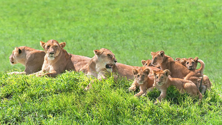 拍全家福本身就是一件难事,尤其是家中还有8个“小孩”那就更难办了。然而洛利翁多野生动物保护区的这群狮子们却十分配合摄影师。照片中,三只成年雌狮和8只幼狮在一座小山丘上休憩,甚是悠闲自得。它们在镜头前整齐排列,摆好姿势,全都专注地看向镜头,这样完美和谐的画面十分难得。