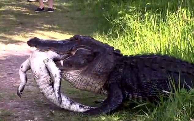 据英国《每日邮报》4月14日报道,美国佛罗里达州自然保护区内一条短吻鳄生吞体型较小的同类,这惊悚的一幕被多名游客拍下并上传视频网站YouTube及其它社交媒体。