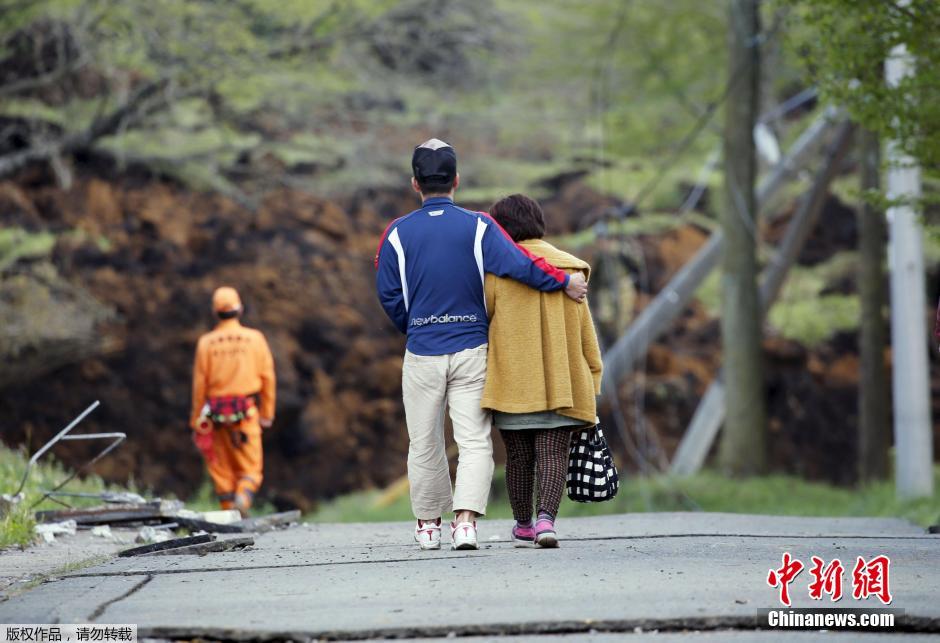 地震引发阿苏郡发生山体滑坡,当地一名男子搀扶着自己的母亲从废墟前走过,他的父亲在山体滑坡中失踪。