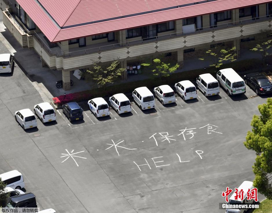 在熊本的一个敬老院的停车场空地上,写着“水、大米,罐头食品及帮助”的字样。据熊本县政府统计,全县有约11万人在723处避难所避难。据日本媒体报道,不少避难所水、食物供应短缺,有灾民称排了3小时队才领到物资,还有避难所灾民出现身体不适。