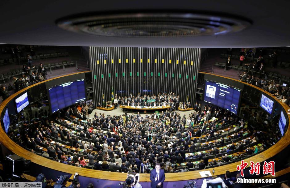 当地时间4月18日,巴西众议院就总统弹劾案举行全体投票表决,截止发稿,已经有300位议员投票,其中224票赞成,72票反对,4票弃权。按照法律规定,弹劾案通过必须得到众议院2/3多数票,即513个议席中至少要获得342张赞成票。图为投票现场。