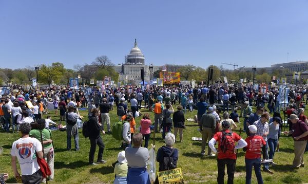 4月17日,在美国首都华盛顿国会山,人们参加反对“金钱政治”的抗议示威。 (新华社记者殷博古摄)