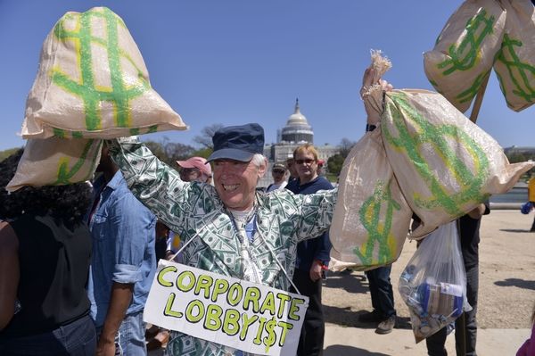 4月17日,在美国首都华盛顿国会山,一名男子打扮成“大公司的说客”参加反对“金钱政治”的抗议示威。 ( 新华社记者殷博古摄)