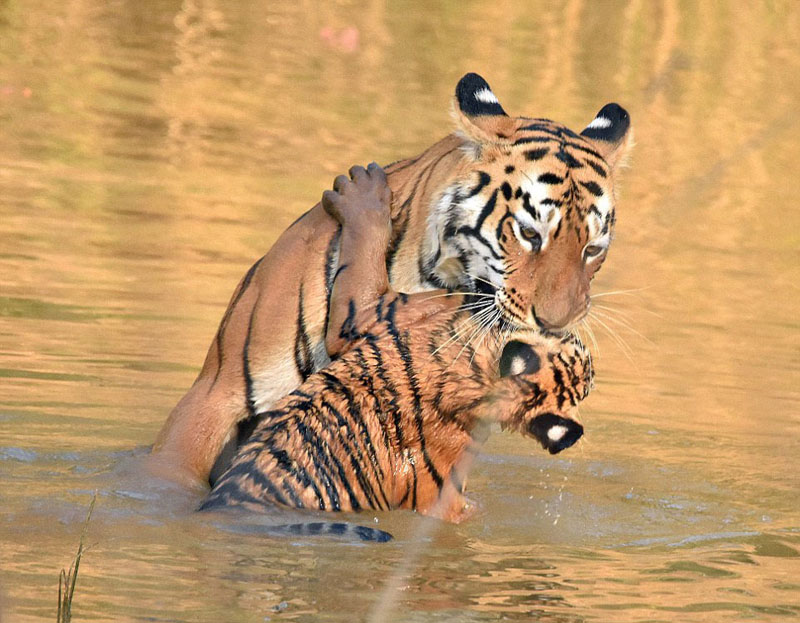 印度虎妈虎崽河中洗澡嬉戏 画面温情(图)