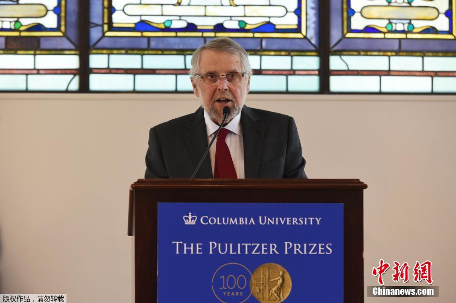 当地时间4月18日,2016年普利策奖获奖名单在纽约哥伦比亚大学公布,美联社获普利策公共服务新闻奖。其中《纽约时报》讲述欧洲难民危机的一组新闻图片获得本届普利策奖的突发新闻摄影奖。图为普利策奖赛事主管Mike Pride宣布获奖名单。