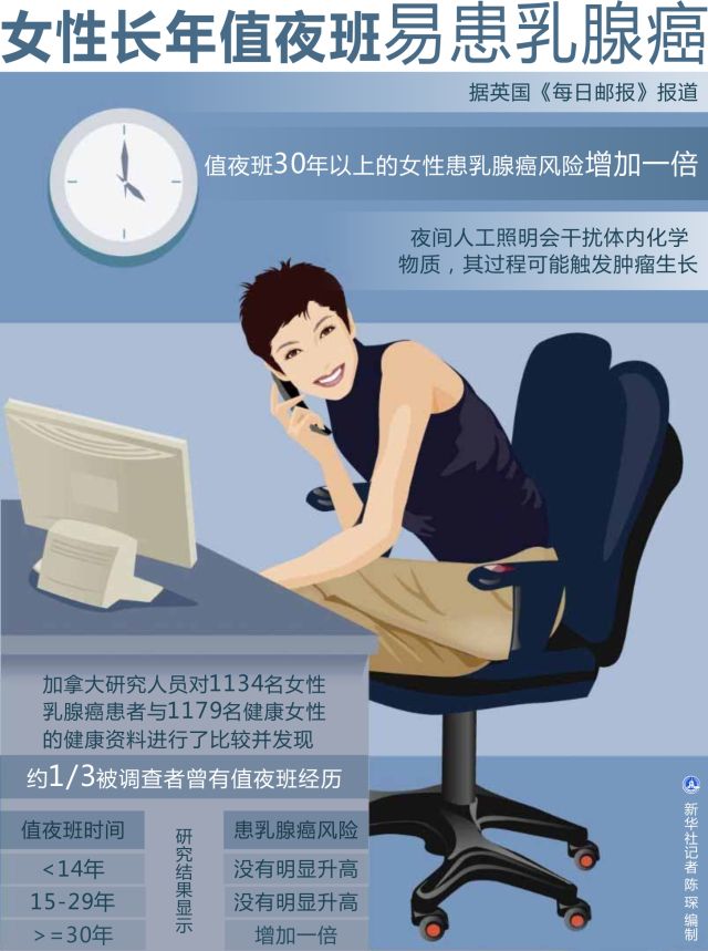 而此前加拿大2013年的一项研究显示,值夜班30年以上的女性患乳腺癌风险增加一倍。