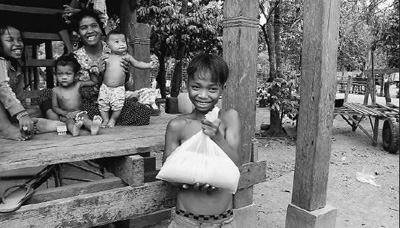 孩子们领到制糖厂送来的白糖后,露出灿烂的笑容。记者 张志文摄