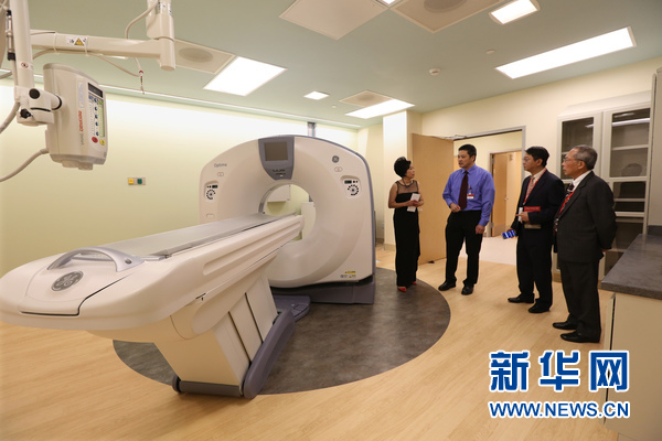 东华医院工作人员陪同公众参观新医务大楼的计算机断层扫描仪。