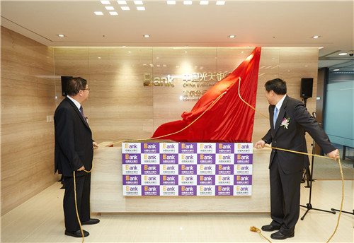 图为光大集团董事长唐双宁(左)、光大银行副行长马腾为首尔分行揭牌。光大集团供图