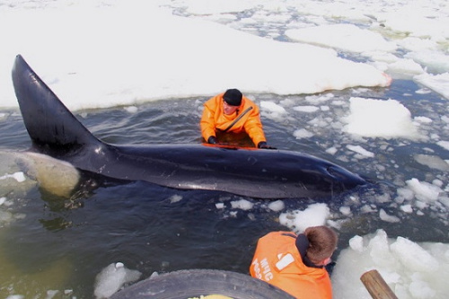 库页岛总局的作业小组闻讯后火速前往事发地点救援。他们跳入浮冰中,在里面劈开一条又一条的通道, 把3大1小杀人鲸拉出来,协助它们脱困。这些杀人鲸在获得自由后,游向大海逃出生天。