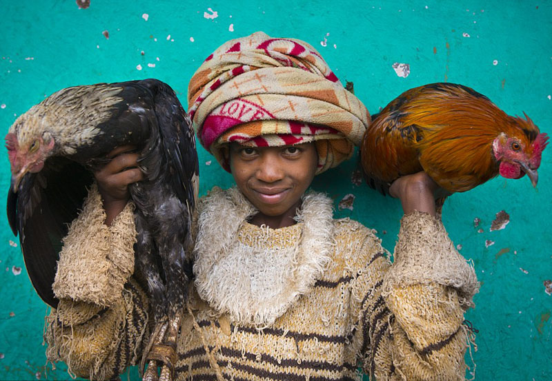 埃塞俄比亚Omo村庄:小男孩手举两只鸡,在当地,鸡比起作为宠物更多的被做成了美食。