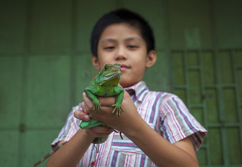 马来西亚槟城:小男孩和他的宠物——亮绿色的蜥蜴。