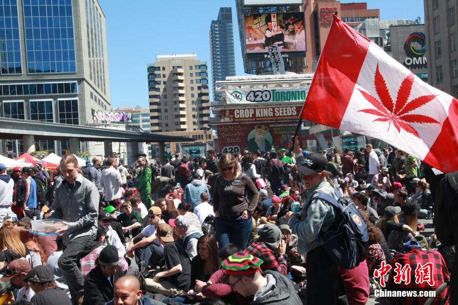4月20日是北美越来越流行的“大麻日”。当天中午,多伦多市中心广场上,上千名吸食大麻的人在此汇集,集体公开吸大麻,呼吁大麻合法化。当天,加拿大卫生部长在纽约联合国总部的一个会议中宣布,推迟该国大麻合法化立法到明年春天。多伦多的活动现场,一些人把加拿大国旗中的红枫叶“偷梁换柱”变成大麻叶。 中新社记者 徐长安 摄