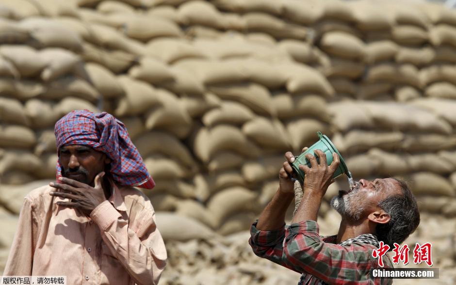4月21日消息,数周来印度的持续高温已在该国南部和东部造成超过160人死亡,官员警告可能还要等数周才会获雨季甘霖解危。据悉,进入4月份之后,印度多个地方气温迅速攀升,突破40摄氏度。图为印度昌迪加尔粮食市场附近,两名工人在喝水。