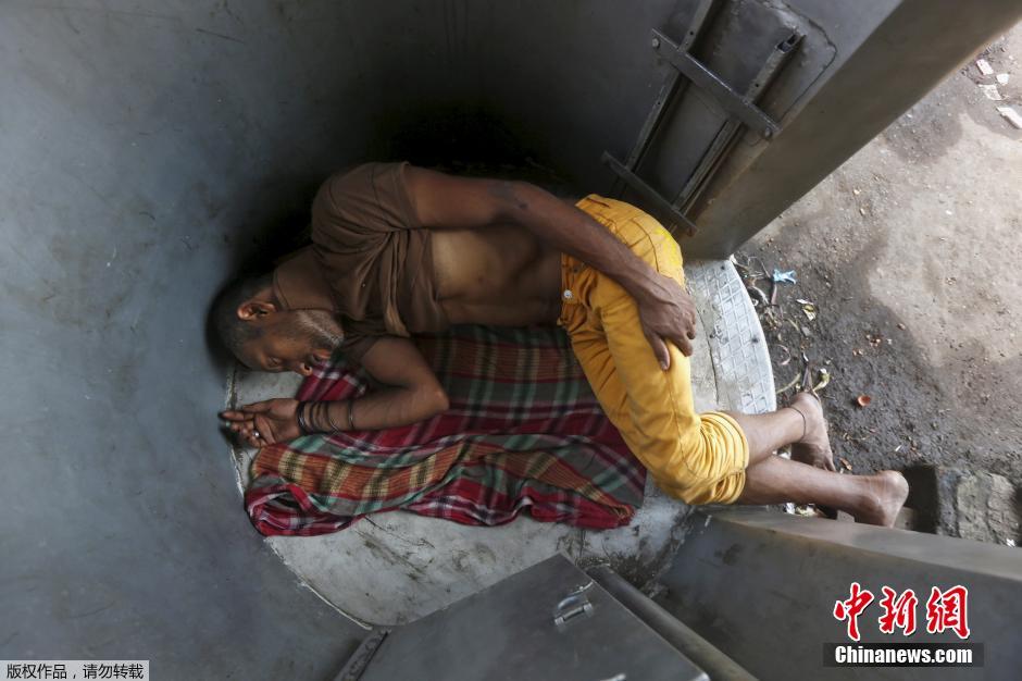4月21日消息,数周来印度的持续高温已在该国南部和东部造成超过160人死亡,官员警告可能还要等数周才会获雨季甘霖解危。据悉,进入4月份之后,印度多个地方气温迅速攀升,突破40摄氏度。图为一位民众在加尔各答的一座警亭中睡觉。