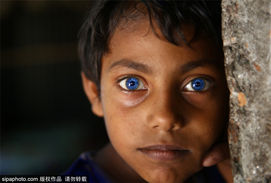2016年4月20日报道,孟加拉国达卡,孟加拉国男孩长有一双罕见的蓝色眼睛,眼眸清澈令人惊讶。(来源:Sipaphoto)