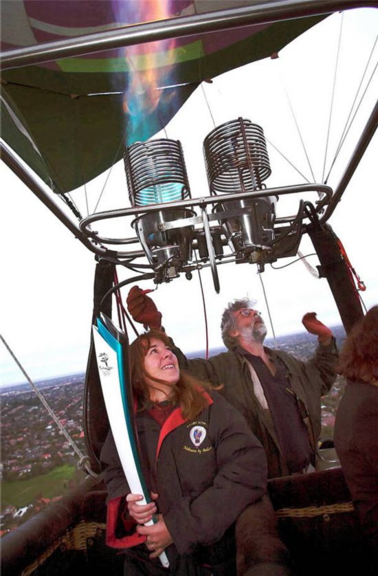 图为2000年7月31日,悉尼奥运会火炬手克里斯·迪沃斯特和他的妻子希瑟驾驶热气球在澳大利亚墨尔本上空传递火炬。