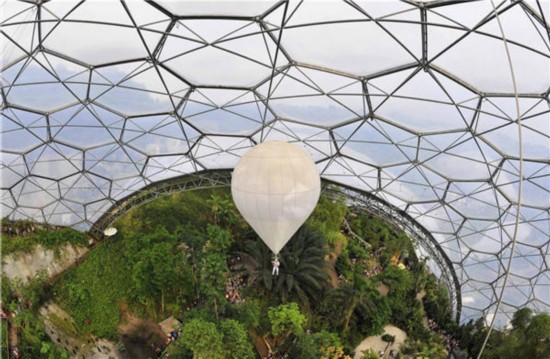 图为2012年5月19日,英国冒险家本·弗格尔手持伦敦奥运会圣火火种驾驶热气球在伊甸园植物园的半球温室内飞过室内雨林上空。