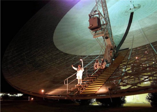图为2000年8月18日,悉尼奥运会火炬手高擎火炬站在南澳大利亚的帕克斯射电天文望远镜巨大的碟型天线中。
