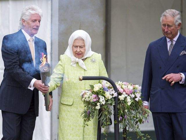 女王点燃庆生火炬,右为查尔斯王子。(图片来源:新华/路透)