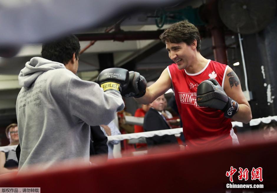 当地时间2016年4月21日,美国纽约,加拿大总理特鲁多在拳击馆展开训练。