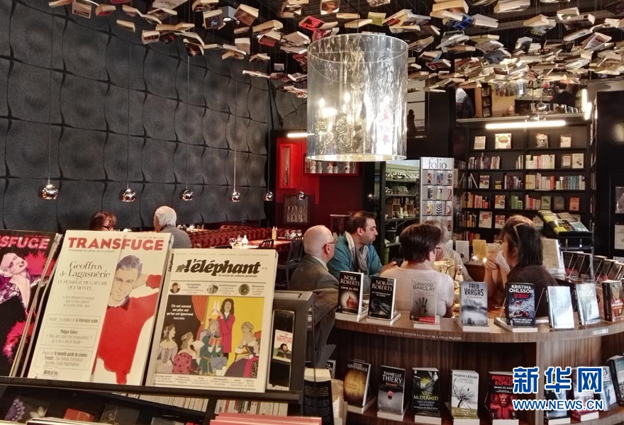 头顶书籍,背靠书籍,在书籍的海洋里品尝美食,是吸引人们到“烹饪与书籍”书店的重要原因。新华网记者宋盈摄
