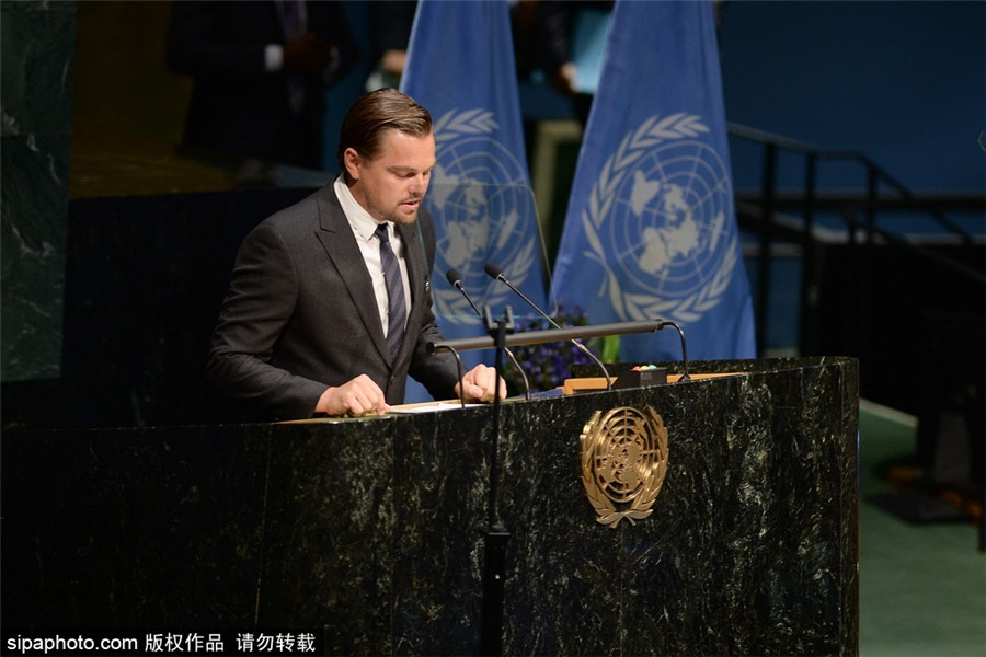 当地时间2016年4月22日,美国纽约,莱昂纳多·迪卡普里奥出席联合国《巴黎协定》高级别签署仪式,并作为联合国和平大使发表演讲。(来源:Sipaphoto)