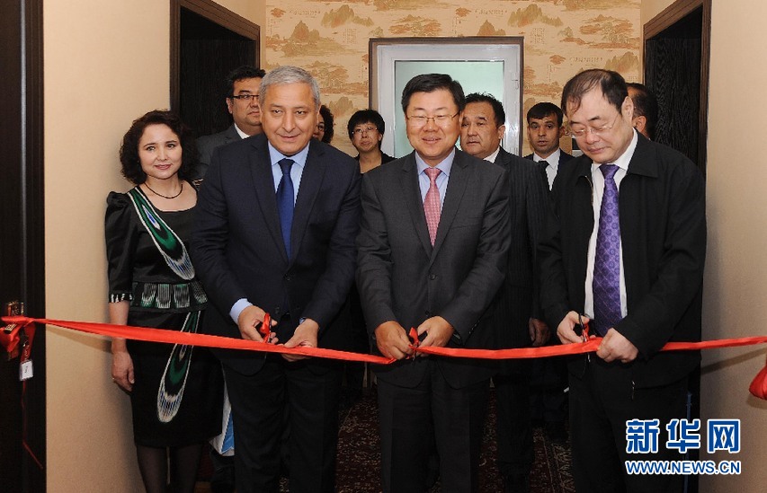 4月22日,乌兹别克斯坦塔什干国立经济大学,中国驻乌兹别克斯坦使馆孙立杰大使(前中)、乌兹别克斯坦塔什干国立经济大学波尔塔巴耶夫校长(前左)和中国新疆农业大学雒秋江(前右)校长共同出席“中国-乌兹别克斯坦教育与科学研究中心”剪彩仪式。 新华网记者沙达提摄