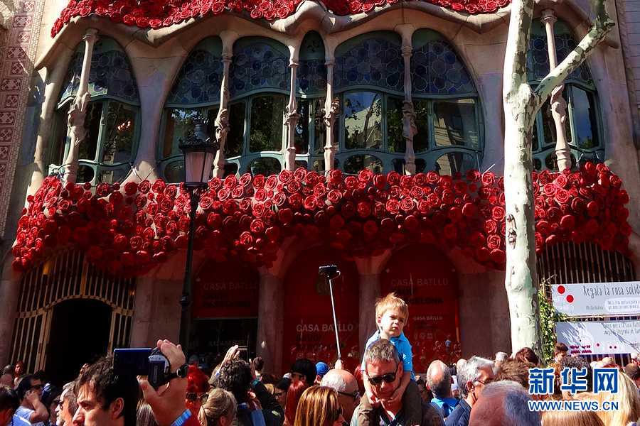 4月23日,巴塞罗那著名建筑“巴特罗之家”被玫瑰图案装饰。新华网记者周喆摄