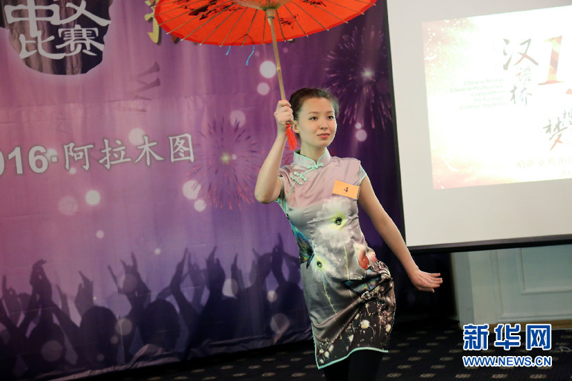 4月23日,来自哈萨克斯坦国际关系与外国语大学的大学生在表演“雨伞舞”。新华网记者周良摄