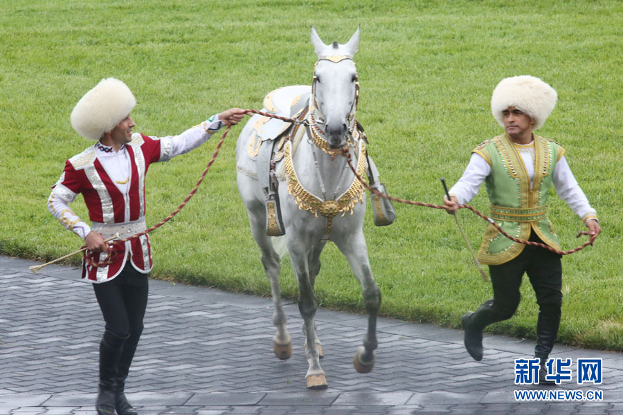 当日,土库曼斯坦为庆祝阿哈尔捷金马(中国称汗血马)节在总统马场举行汗血马选美大赛。一匹名为“别格汗”的8岁鼠灰色马受到评委们的青睐,赢得2016年度“最美汗血马”称号。新华网记者 卢敬利 摄