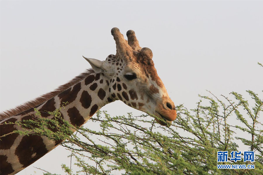 锡尔班尼亚斯岛上一只长颈鹿在吃草。新华网记者 安江 摄
